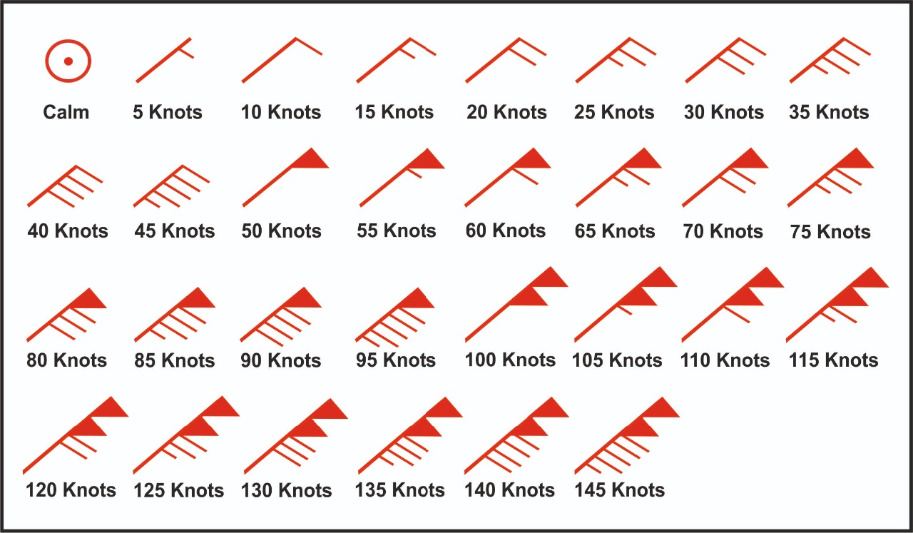 Na synoptických mapách se vítr často značí pomocí tzv. větrných praporků. Tyčka ukazuje směr, odkud vítr přichází, a malé čárky/trojúhelníčky na ní udávají přibližnou rychlost. Laikovi stačí znát základní hodnoty 5–10–50 (uzlů) a princip sčítání. Směr se čte podle tyčky (míří proti větru).